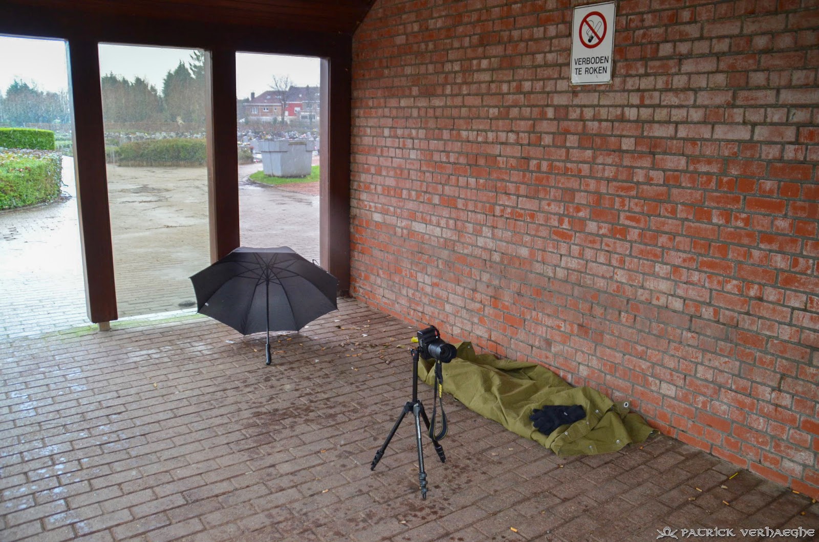 We besloten om onze pipes op de stenen bank van het CWGC plot te leggen. Stuart plaatste het statief open en begon het lijstje met te zoeken graven te bekijken toen de wind kwam opzetten. Resultaat, met openstaande paraplu waaide het statief om zodat het in feite ook niet echt een hulp was. Door de weersomstandigheden, die we zo nog niet eerder hadden meegemaakt, moesten we inventief zijn en steeds zoeken naar oplossingen voor de regen. Kurt zag een grote schuilplaats bij de ingang en besloot om de pipes daar veilig en uit de regen te leggen. Op deze manier konden we iets aangenamer werken bij het nemen van foto's en andere. Net toen we zouden beginnen zagen we bij de ingang een bekend iemand arriveren. Het was Patrick Verhaeghe die ons vandaag zou volgen. We zegden elkaar een goeie dag en waren er het allen over eens, het zou een lange natte koude dag worden.